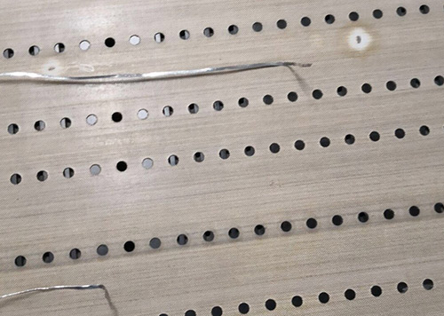 如圖兩排孔的串焊機皮帶孔規(guī)格正常寬為:0.5cm,孔長:1.2cm