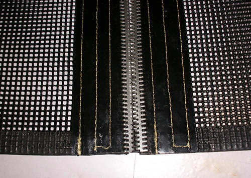 2.墻式接頭法:在網(wǎng)帶的兩頭分別用凱夫拉高溫布做圓柱狀的布條子,客戶也是直接用我們配好的鋼絲直接穿進凱夫拉高溫布的小孔里面就行了。這種接頭方式的好處就是接頭處很耐磨,但是抗拉強度并不是很高。