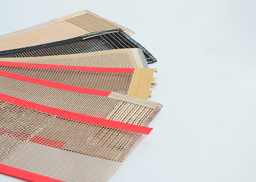 2.墻式接頭法:在網(wǎng)帶的兩頭分別用凱夫拉高溫布做圓柱狀的布條子,客戶也是直接用我們配好的鋼絲直接穿進凱夫拉高溫布的小孔里面就行了。這種接頭方式的好處就是接頭處很耐磨,但是抗拉強度并不是很高。